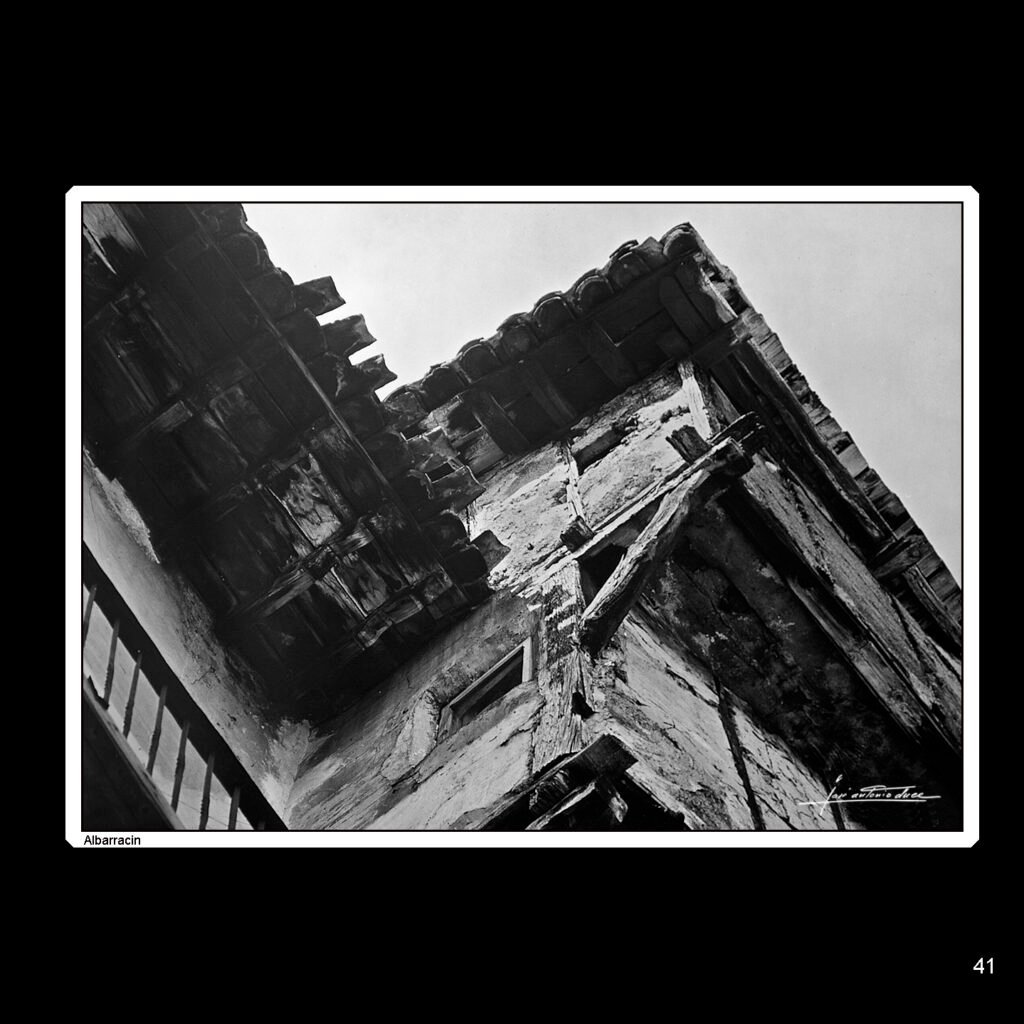 Un detalle de una casa. Esta es la imagen que José Antonio Duce seleccionó en Albarracín para su serie fotográfica «Aragón en mi recuerdo». Al contrario que en otras ocasiones, no es una vista o monumento reconocible; y sin embargo, cualquiera que haya visto el pueblo sentirá que sí, que estas construcciones son Albarracín. Duce ha sabido encontrar el espíritu del pueblo en un pequeño detalle.
