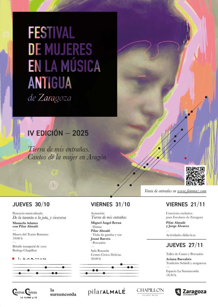La reivindicación del importante y olvidado papel de las mujeres como transmisoras de la tradición musical aragonesa a lo largo de la historia centrará este año la cuarta edición de FEMMAZ (Festival de Mujeres en la Música Antigua de Zaragoza). Comenzará esta semana con las dos primeras citas: el jueves 30 (Teatro Romano, 19h) descubriendo las similitudes entre la taranta italiana y la jota aragonesa; y el viernes 31 con una gran actuación en el Centro Cívico Delicias (20h) del bailarín Miguel Ángel Berna y los músicos Josué Barrés y Pilar Almalé, directora del Festival. Otras dos convocatorias completarán esta edición posteriormente los días 21 y 27 de noviembre.