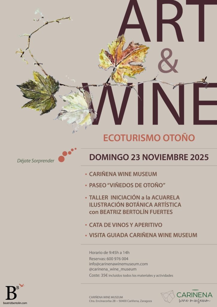 La cita comenzará a las 9:45 h con una bienvenida a los participantes en el Cariñena WineMuseum. A continuación, tendrá lugar un paseo guiado por el viñedo cercano, donde se podrán observar las tonalidades únicas del campo en otoño y recoger elementos naturales para trabajar en el taller. La sesión artística estará orientada a descubrir la técnica de la acuarela aplicada a la ilustración botánica, tomando como inspiración la morfología de la vid y su entorno. La propuesta se completa con una degustación de vinos locales y una visita por los espacios expositivos del museo.