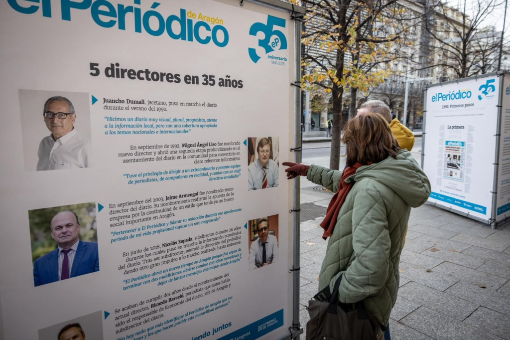 La historia de los 35 años de El Periódico de Aragón está en la calle hasta el 12 de diciembre, donde ciudadanos y visitantes podrán conocer la trayectoria de este diario a través de diez tótems situados en el paseo Independencia de Zaragoza.