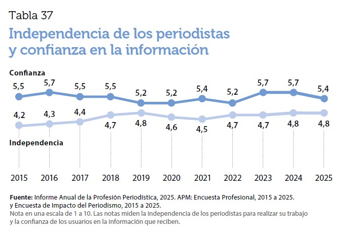 Según el ‘Informe Anual de la Profesión Periodística 2025’, los ciudadanos califican con un 5,4 la confianza en la información de los medios, la nota más baja desde 2022; y para los jóvenes, un colaborador no periodista de un medio (29%) y una fuente directa en redes sociales (28%) generan más credibilidad y confianza que los periodistas (23%).