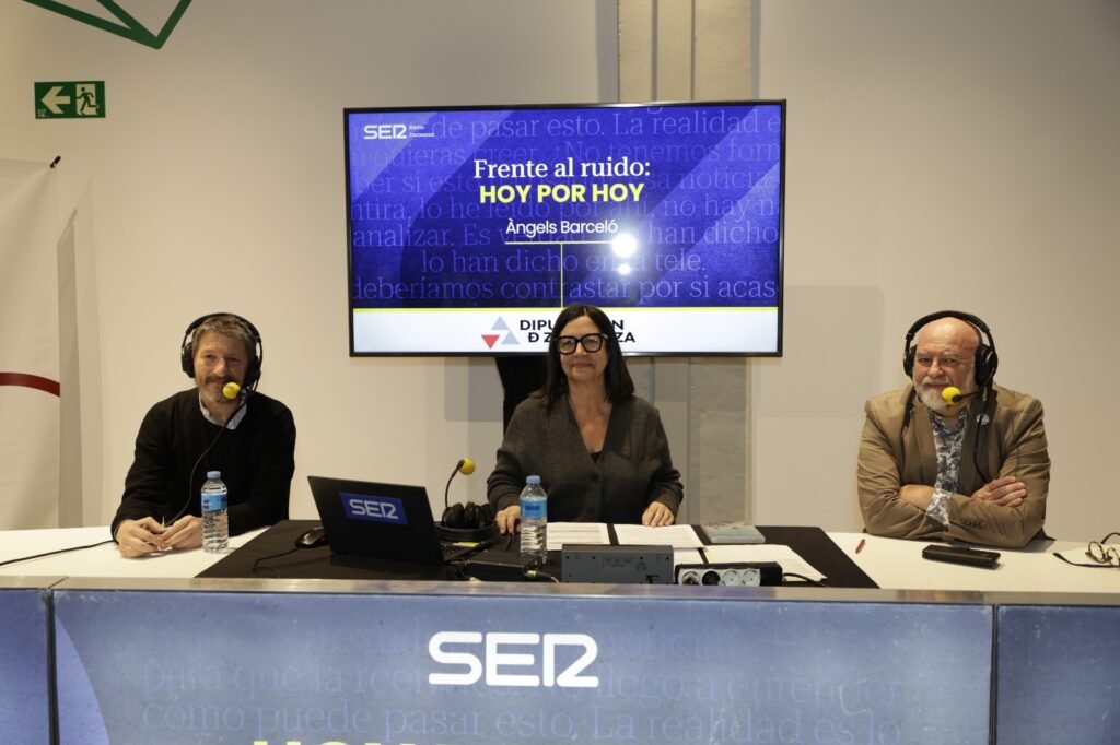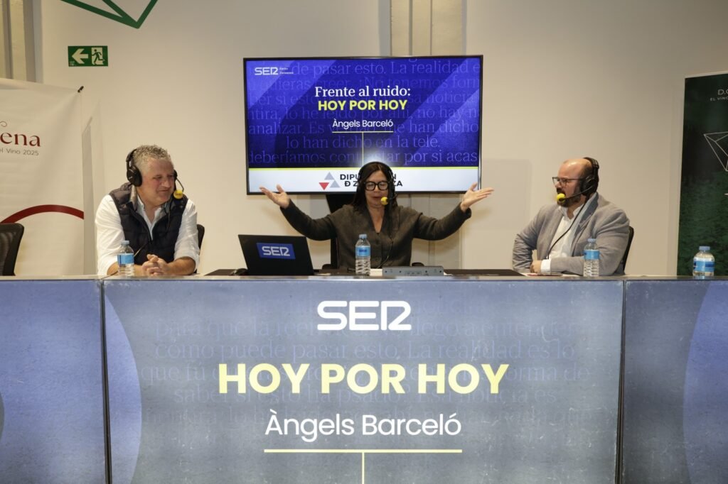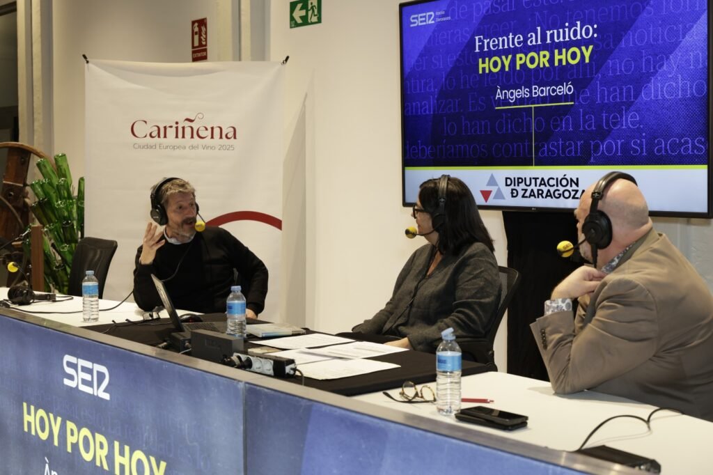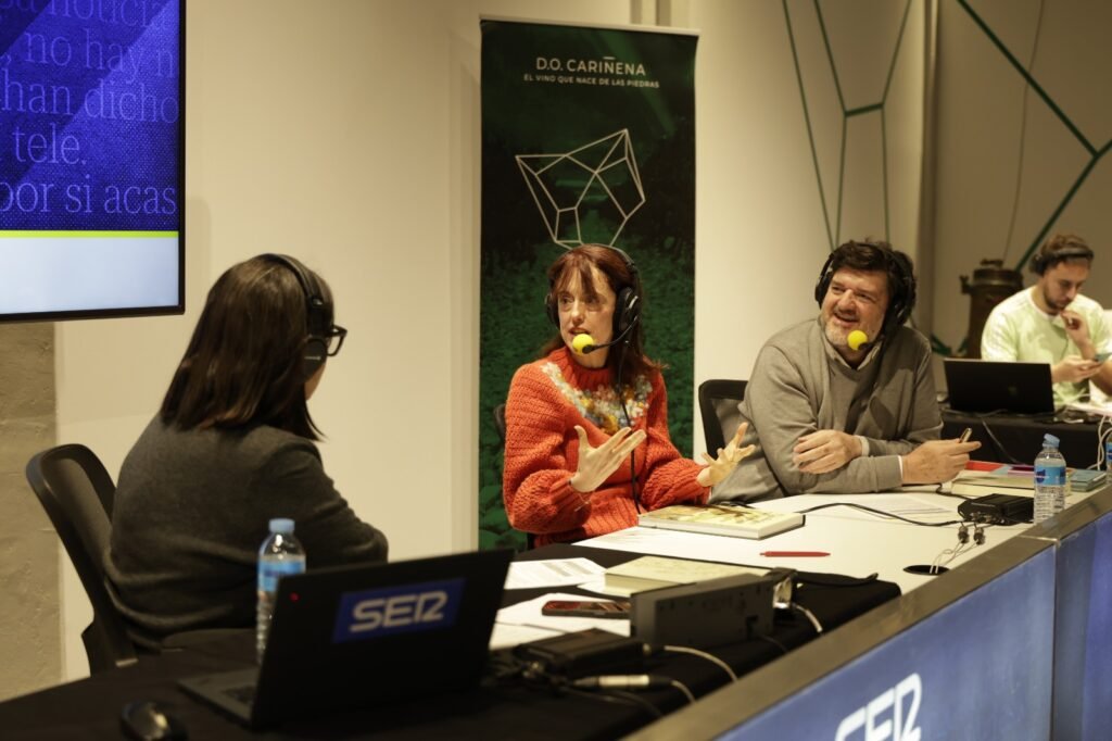 El territorio de la Denominación de Origen Cariñena y sus “vinos que nacen de las piedras” han sido hoy protagonistas de “Hoy por hoy”, el matinal de Cadena SER dirigido y presentado por Àngels Barceló. El programa líder en audiencia de la radio nacional (más de 3,4 millones de oyentes diarios en el último trimestre) ha trasladado su estudio al renovado Cariñena WineMuseum, desde donde la presentadora y su equipo han ofrecido distintos contenidos y entrevistas especiales, como una entrevista con el presidente de la D.O. Cariñena, Antonio Serrano, quien ha señalado que “las piedras, las variedades autóctonas de Aragón y el cierzo son las claves de la ecuación perfecta que imprime el carácter único a nuestro vino”.
