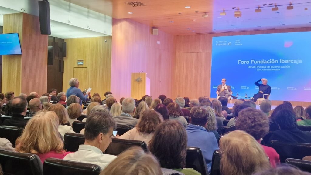Organizada por la Fundación Ibercaja, la charla permitió a David Trueba combinar reflexiones con historias personales en torno al cine y la literatura de una forma cercana y humorística que, sin duda, logró conectar y despertar continuas risas y aplausos entre el público, que abarrotó la sala grande del Patio de la Infanta de Ibercaja en Zaragoza. Una de las anécdotas más destacadas fue la explicación del llamado “espíritu de Borja”, un concepto que utiliza para referirse al optimismo y la convicción frente a la vida, no solo por la famosa restauración del Ecce homo de la localidad zaragozana. “Si no le dan el Nobel, que se jodan los suecos”, bromeó al recordar a la pareja de borjanos que aseguraban que Carlos López Otín, el científico español, merecía ese reconocimiento.