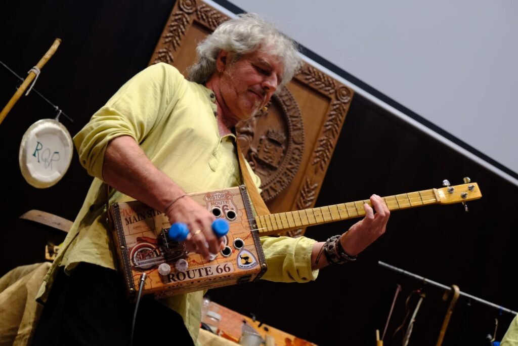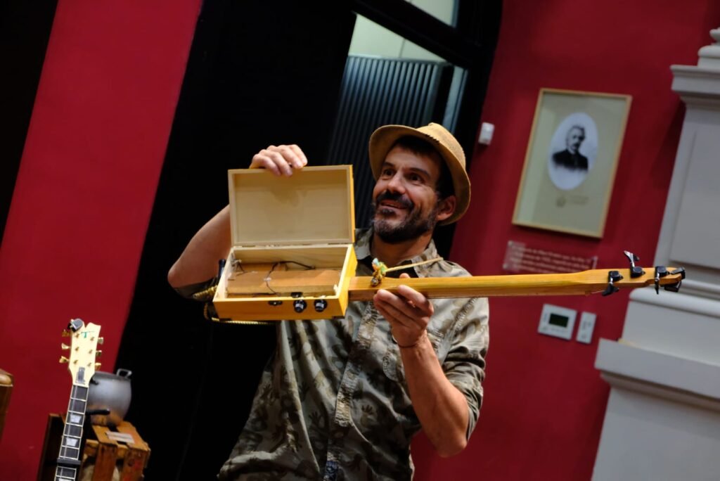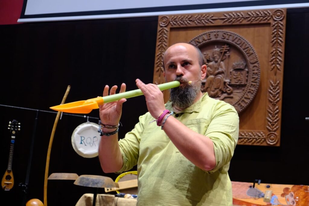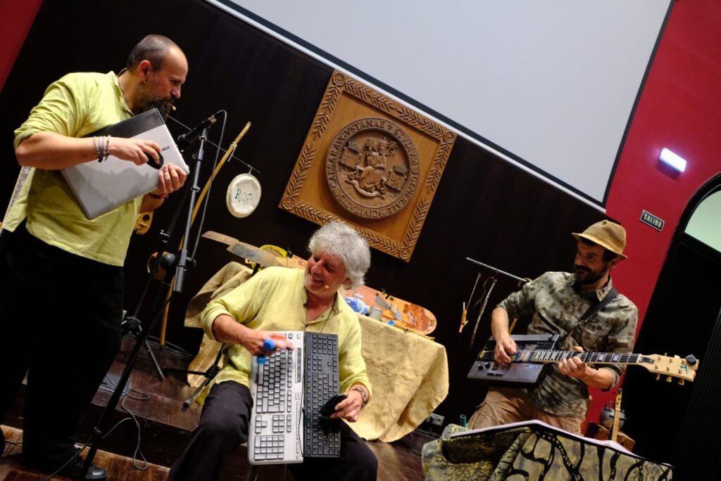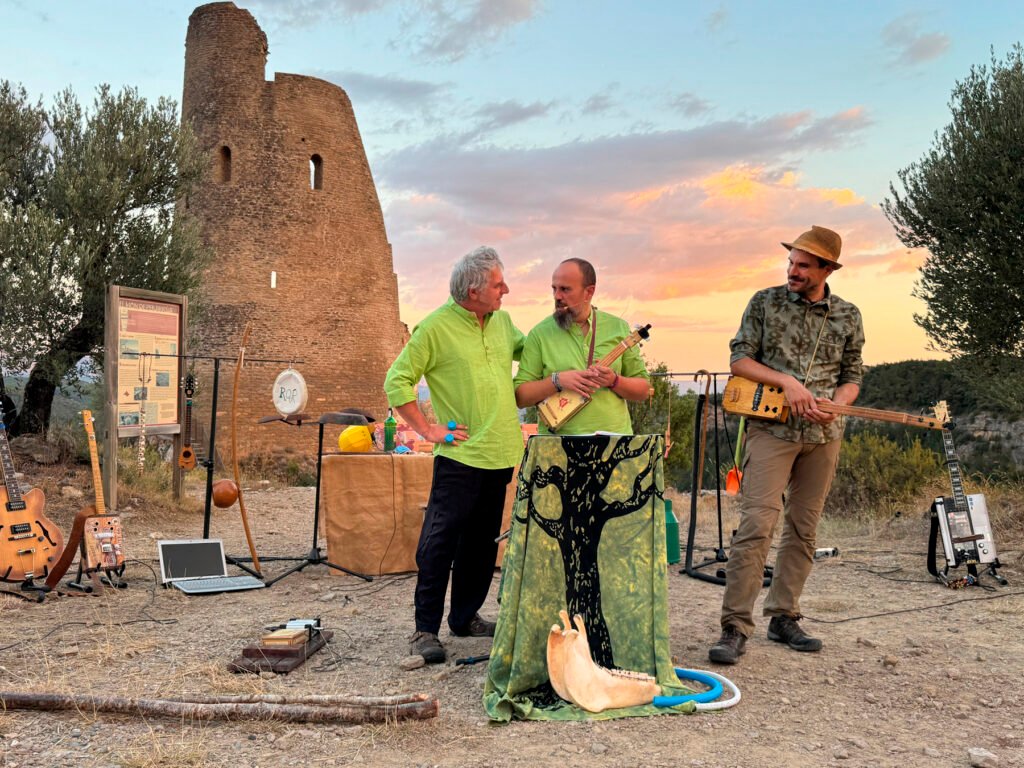 Una propuesta escénica con la que pronto alcanzarán las 200 representaciones a lo largo de toda la Península Ibérica, tanto en festivales de toda índole como en pequeños pueblos. El grupo de Graus (Huesca) quiere transmitir “un mensaje con moraleja, pero sin sermón sobre la sensibilización en torno al reto del cambio climático, la necesidad de cambiar nuestros hábitos para reconectar con la naturaleza y nuestra herencia cultural”. Para ello, utiliza instrumentos prehistóricos y reciclados como plumas de quebrantahuesos, un ordenador convertido en laúd, batefuegos, taburete, goma de mascarilla, botella de anís, regadera, piedras, salterio fabricado en una tabla de snowboard y chiflo, tapones de botella o cucharas metálicas.
