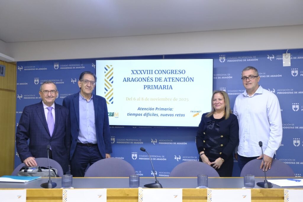 Leandro Catalán, presidente del Sindicato de Médicos de Atención Primaria; Mercedes Ortín, secretaria general de CESM Aragón; Agustín Galve, presidente de esta edición del Congreso; y Raúl Vallés, médico de familia del centro de salud de Zuera en San Mateo de Gállego, han presentado los detalles de este encuentro, que reunirá a cerca de 300 profesionales “para compartir experiencias, debatir y actualizarnos en esta maravillosa y exigente profesión”.